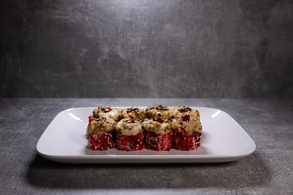 Rolle mit geräuchertem Aal, Frischkäse Philadelphia, Gurke und Tamago-Omelett, bedeckt mit einer goldenen Käsehaube, Unagi-Sauce und bestreut mit geröstetem Sesam.